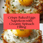 Baked Eggs Napoleon is a delightful breakfast or brunch recipe featuring flaky puff pastry shells filled with a creamy spinach mixture and topped with perfectly baked eggs. This elegant dish combines the crispiness of golden puff pastry with the rich flavors of sautéed spinach, garlic, cream cheese, Parmesan, and subtly spiced with nutmeg. Topped with a runny baked egg and fresh chives, it makes for an impressive yet easy-to-make meal that’s perfect for weekend mornings or special occasions.