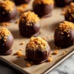 4. Chocolate Time: Melt the chocolate chips and optional coconut oil in a microwave-safe bowl using 30-second intervals, stirring between each until smooth and glossy. Dip each chilled truffle into the melted chocolate, tap off excess, and place back on the parchment paper. Optionally, sprinkle crushed Biscoff cookies or sea salt on top before the chocolate sets.