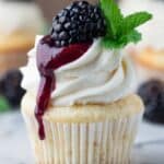 - Step 11: Garnish cupcakes with leftover blackberry sauce, a fresh blueberry, and a mint leaf before serving.