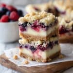 These Blueberry Cream Cheese Bars combine a buttery oat crust with a rich, creamy sweetened cream cheese filling, topped with fresh blueberries and an oat crumble. Baked to golden perfection, they offer a delightful balance of tangy fruit and sweet cream in every bite—perfect for dessert or a special snack.