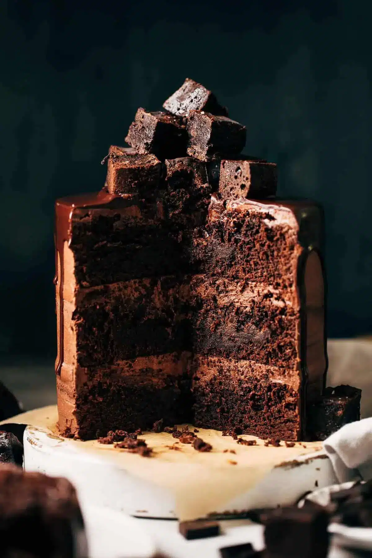 Keywords: brownie cake, chocolate cake, chocolate dessert, layered cake, cream cheese frosting, marbled chocolate cake