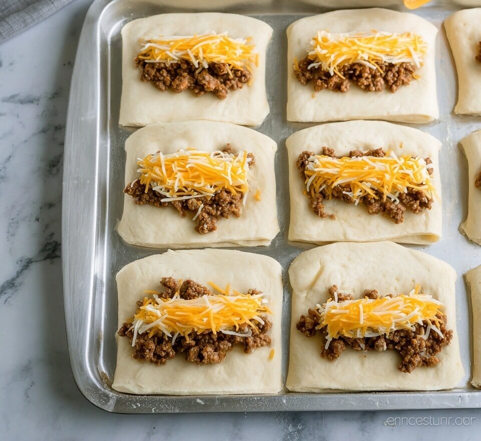 - Step 5: Place about a tablespoon of the seasoned beef in the center of each rectangle, top with a halved cheese stick, then carefully roll up the dough. Pinch the seams closed to seal the filling inside.