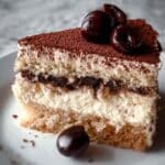 A close-up view of a layered dessert slice on a white plate, featuring three layers of light brown cake alternated with two layers of creamy, off-white filling. The top of the dessert is covered with a thick layer of dark brown cocoa powder and decorated with two dark, glossy cherries placed on the surface. The textures show soft, moist cake layers and light, airy cream, all set against a white marbled background. Photo taken with an iphone --ar 4:5 --v 7
