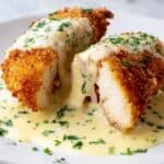 Keywords: Chicken Cordon Bleu, Swiss Cheese Sauce, Panko Breadcrumbs, Stuffed Chicken Breast, Classic Comfort Food