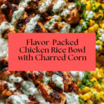 Keywords: chicken rice bowl, grilled chicken, charred corn, Mexican rice bowl, easy dinner, weeknight meal, creamy sauce, cotija cheese, healthy bowl