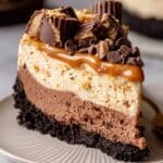 A close-up of a slice of layered cheesecake on a white plate with a ridged texture, set on a white marbled surface. The cheesecake has three main layers: a dark crumbly chocolate crust at the bottom, a thick middle layer of smooth milk chocolate mousse, and a top layer of creamy, light peanut butter cheesecake with visible specks and small chunks. The top is finished with a glossy layer of peanut butter, mini dark chocolate chips scattered around, and several chopped chocolate peanut butter cups placed on top for decoration. Photo taken with an iphone --ar 4:5 --v 7