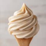 A close-up image of a soft, smooth, creamy frosting with a light beige color, swirled into three visible layers with delicate, flowing ridges and curves that create a peak at the top. The frosting sits on a light wooden spoon with visible grain texture, held upright against a soft white marbled background that is blurred out. The focus is sharp on the texture and shape of the frosting, showing its smooth and slightly airy consistency. photo taken with an iphone --ar 4:5 --v 7