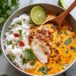 - Assemble and Serve: Serve the sliced chicken in bowls topped with the creamy coconut broth. Garnish with chopped green onions, fresh cilantro, and lime wedges for added freshness and zing.