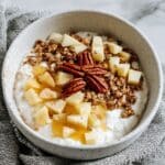This bowl is best enjoyed fresh due to the cottage cheese and warm apples. If needed, store leftovers separately in airtight containers in the refrigerator for up to 1 day. Reheat the apple mixture gently on the stove before serving again, then add fresh cottage cheese and toppings.