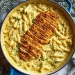A blue skillet filled with creamy yellow pasta sauce mixed with penne pasta, speckled with green herbs and black pepper, fills the entire pan. On top, there is a golden-brown breaded chicken breast sliced into thick pieces lined up horizontally across the center. The skillet is set on a white marbled surface with frosted pine branches around it. Photo taken with an iphone --ar 4:5 --v 7