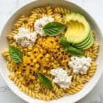 A bowl of pasta with four main visible layers: the base layer is made of pale yellow, spiral-shaped pasta, slightly glossy and forming the bulk at the bottom; scattered on top are bright yellow grilled corn kernels with some charred black spots adding texture and color contrast; dollops of white ricotta cheese are spread unevenly around, looking soft and crumbly with a slightly grainy texture; fresh dark green basil leaves and sliced avocado pieces with light green flesh are placed on top, adding a fresh and creamy look. The bowl is white with a subtle speckled texture, set against a white marbled background. photo taken with an iphone --ar 4:5 --v 7