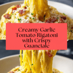 This Creamy Tomato Garlic Rigatoni Pasta recipe combines perfectly al dente rigatoni with a rich, flavorful sauce made from crispy guanciale, aged Pecorino Romano and Parmesan cheeses, and a tantalizing garlic-infused olive oil. Tossed with eggs to create a luscious, silky carbonara-style sauce, this quick and comforting dish is perfect for an indulgent weeknight dinner or a special occasion.