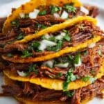 - Assemble and garnish: Fill each crispy tortilla with the shredded beef mixture. Top with freshly chopped cilantro and diced onions. Serve immediately while warm and crispy.