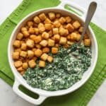 Keywords: Spinach casserole, creamy spinach side dish, baked spinach, mushroom soup casserole, crunchy bread topping