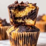 - Fill Muffin Liners: Alternate spoonfuls of pumpkin and chocolate batters into each muffin liner, filling them about ¾ full. Optionally, sprinkle an extra ¼ cup mini chocolate chips on top of each muffin for added texture and chocolate bursts.