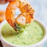 Keywords: roasted shrimp, green goddess dip, easy shrimp recipe, baked shrimp, appetizer, healthy dip, Greek yogurt dip, basil dip