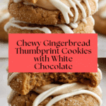 These Gingerbread Thumbprint Cookies are a delightful holiday treat featuring a spiced gingerbread cookie base with a luscious white chocolate and molasses filling. The cookies are soft, mildly spiced with ginger, cinnamon, and nutmeg, and finished with a smooth white chocolate drizzle, perfect for festive occasions.