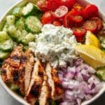 - Assemble the Bowls: In each bowl, layer a base of cooked rice or quinoa, followed by shredded romaine, grape tomatoes, cucumber, and red onion. Top with sliced chicken, a sprinkle of feta cheese, and a generous dollop of tzatziki sauce. Serve immediately and enjoy!