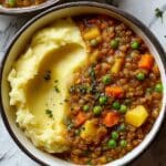 A comforting and nutritious Hearty Lentil Stew served over creamy mashed potatoes. This plant-based meal features tender lentils simmered with vegetables, warming spices, and tomato, paired with buttery mashed potatoes for a satisfying dinner perfect for any season.