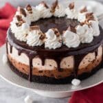 Store the cheesecake covered in the refrigerator for up to 4 days. To reheat, allow the cheesecake to come to room temperature or serve chilled, as reheating can affect the texture. The ganache topping holds up well in the fridge but refresh the whipped cream topping just before serving.