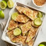 The image shows a white square tray filled with several triangular pieces of a flat, baked snack that has a rough, crunchy texture with small brown bits on top. Bright green lime slices are scattered evenly among the pieces, adding a fresh pop of color. The tray is lined with white parchment paper, and the whole setup sits on a white marbled surface. In the top right corner, there are two small white bowls, one with crushed brown bits and the other with some green limes, slightly out of focus. photo taken with an iphone --ar 4:5 --v 7
