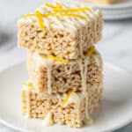These Lemon Rice Krispy Treats are a zesty twist on the classic marshmallow cereal bars, combining citrusy lemon zest and extract with gooey marshmallows and crunchy Rice Krispies for a bright, chewy, and sweet snack. Finished with a drizzle of white chocolate and a sprinkle of fresh lemon zest, they are perfect for a refreshing dessert or an energizing treat.