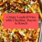 Loaded fries are a delicious, crowd-pleasing snack perfect for any casual get-together or game day. Crispy French fries topped with melted cheddar, crispy bacon, fresh green onions, and a drizzle of ranch dressing make every bite irresistible.