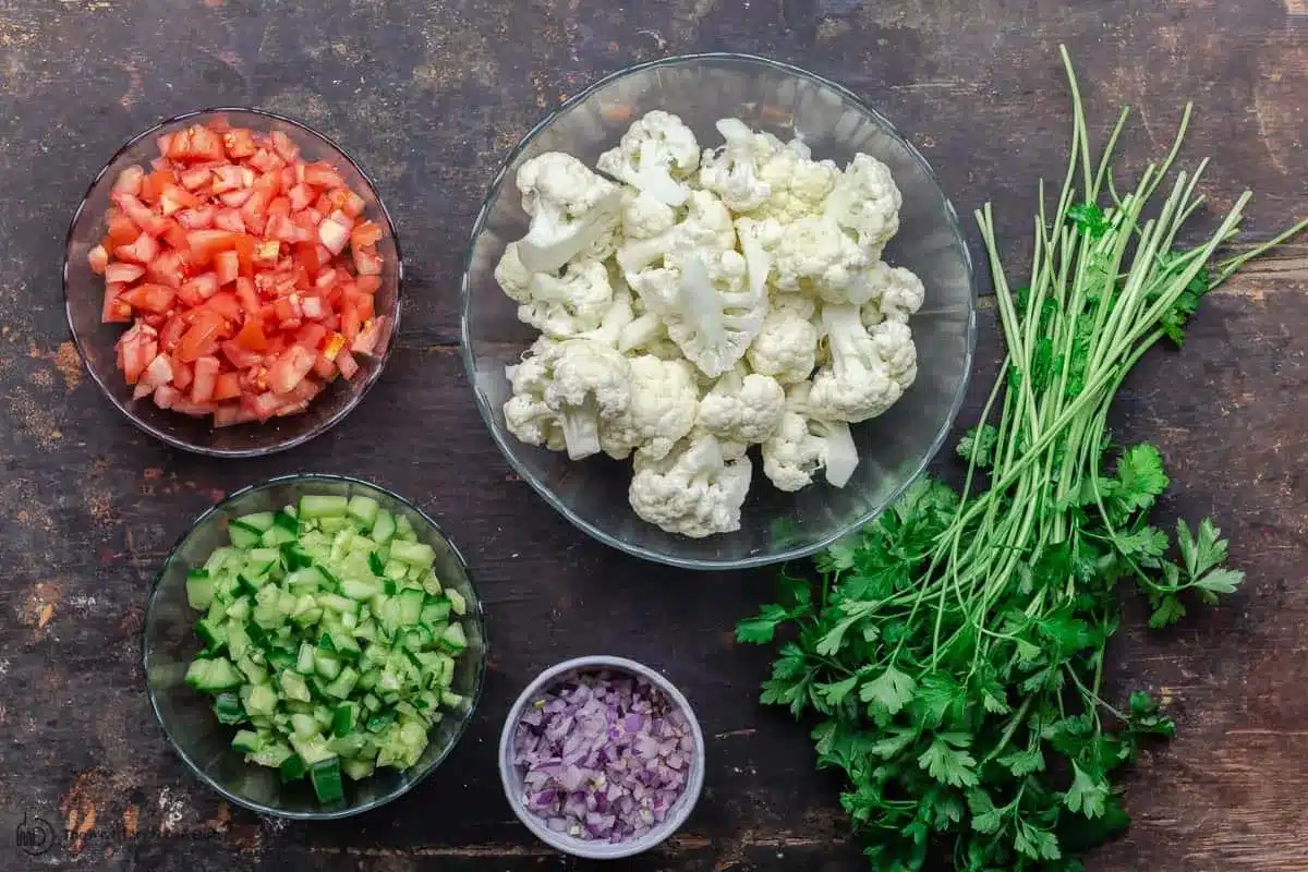- Combine the vegetables: In a large mixing bowl, mix together the blanched cauliflower, cherry tomatoes, thinly sliced red onion, black and green olives, and chopped fresh parsley.