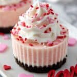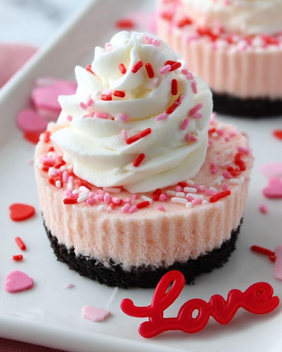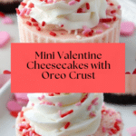 These Mini Valentine Cheesecakes are a perfect festive dessert for celebrating love. Featuring a creamy, smooth pink cheesecake filling on a buttery Oreo crumb crust, these bite-sized treats are baked to perfection and topped with whipped cream and sprinkles for a fun, romantic touch.