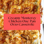 Keywords: Monterey Chicken, One-Pan Meal, Orzo Casserole, Creamy Chicken Bake, Rotisserie Chicken Recipe, Easy Dinner Casserole