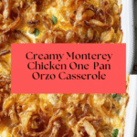 This Monterey Chicken One-Pan Orzo is a creamy, comforting casserole that’s perfect for busy weeknights. Packed with tender chicken, fresh spinach, and melty Monterey Jack cheese, it’s an easy meal that comes together in one dish. The crispy fried onions on top add a delicious crunch that everyone will love.