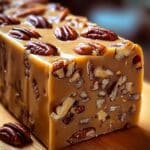 The image shows a thick rectangular block of light brown caramel fudge filled with many pieces of pecans, giving it a textured look inside. The top layer of the fudge is smooth and glossy, decorated with whole pecan halves scattered evenly on the surface. The fudge block has clean edges and is placed on a wooden board, with a warm, slightly blurred background. The pecans embedded inside have a mix of light tan and deep brown shades, contrasting with the soft caramel color around them. Photo taken with an iphone --ar 4:5 --v 7