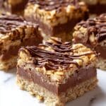 - Top with Remaining Oats and Drizzle: Spoon the remaining oat mixture over the chocolate layer, pressing gently to form an even top layer. Drizzle the reserved chocolate mixture on top for decoration.