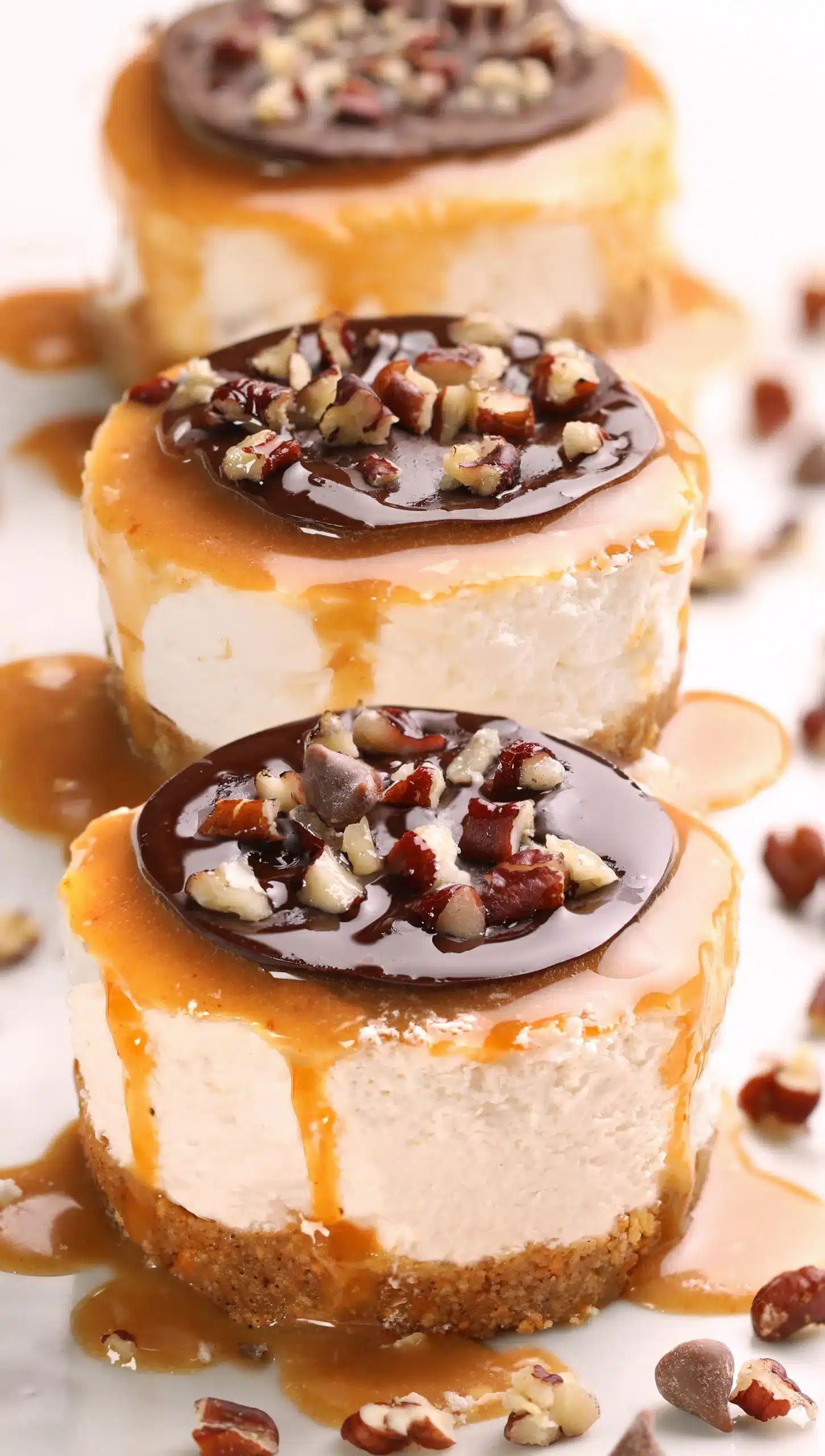 Spoon between half a tablespoon and one tablespoon of caramel sauce over each cheesecake, then add a dollop of the chocolate ganache on top. Gently spread the ganache to almost completely cover the caramel, creating that classic turtle candy look. Finally, sprinkle chopped pecans and mini chocolate chips on top to add crunch and visual appeal. Your mini cheesecakes are now ready to enjoy or store!