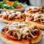 These Old School Pizza Burgers combine the best of two comfort foods: juicy seasoned ground beef with flavorful pizza sauce, all topped with melted sharp cheddar cheese on toasted burger buns. Baked to perfection, they are perfect for a fun family meal or casual gathering.