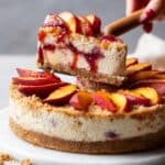 10. Serve the cheesecake: Remove cheesecake from springform pan and transfer to a serving plate. Layer roasted peach topping and any accumulated juices over the cheesecake. Sprinkle reserved streusel on top. Slice with a sharp knife and serve.