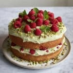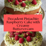 This Pistachio Raspberry Cake is a delightful layered dessert combining the nutty richness of pistachios with the sweet-tart burst of fresh raspberries. Moist, vibrant green pistachio cake layers envelop a smooth pistachio buttercream and raspberry jam filling, topped with fresh raspberries, chopped pistachios, and mint for an elegant finish. Perfect for celebrations or a special afternoon treat, this cake is baked to perfection with a luscious cream frosting that highlights the nutty berry flavors.