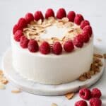 This Raspberry Almond Cake features a tender white almond cake layered with vibrant, tangy raspberry filling and frosted with a luscious shortcut Swiss meringue buttercream. The delicate almond and vanilla flavors complement the fresh and cooked raspberries beautifully, topped with fresh raspberries and toasted slivered almonds for an elegant finish. Perfect for celebrations or special occasions, this cake combines classic baking techniques and fresh ingredients for a stunning and delicious dessert.