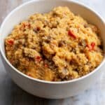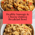 A hearty and nutritious Sausage and Cheese Quinoa Breakfast Bowl featuring lightened-up breakfast sausage, fluffy scrambled eggs mixed with Greek yogurt and spices, wholesome quinoa, and melted cheddar cheese. This protein-packed breakfast is flavorful and perfect for a satisfying start to your day.