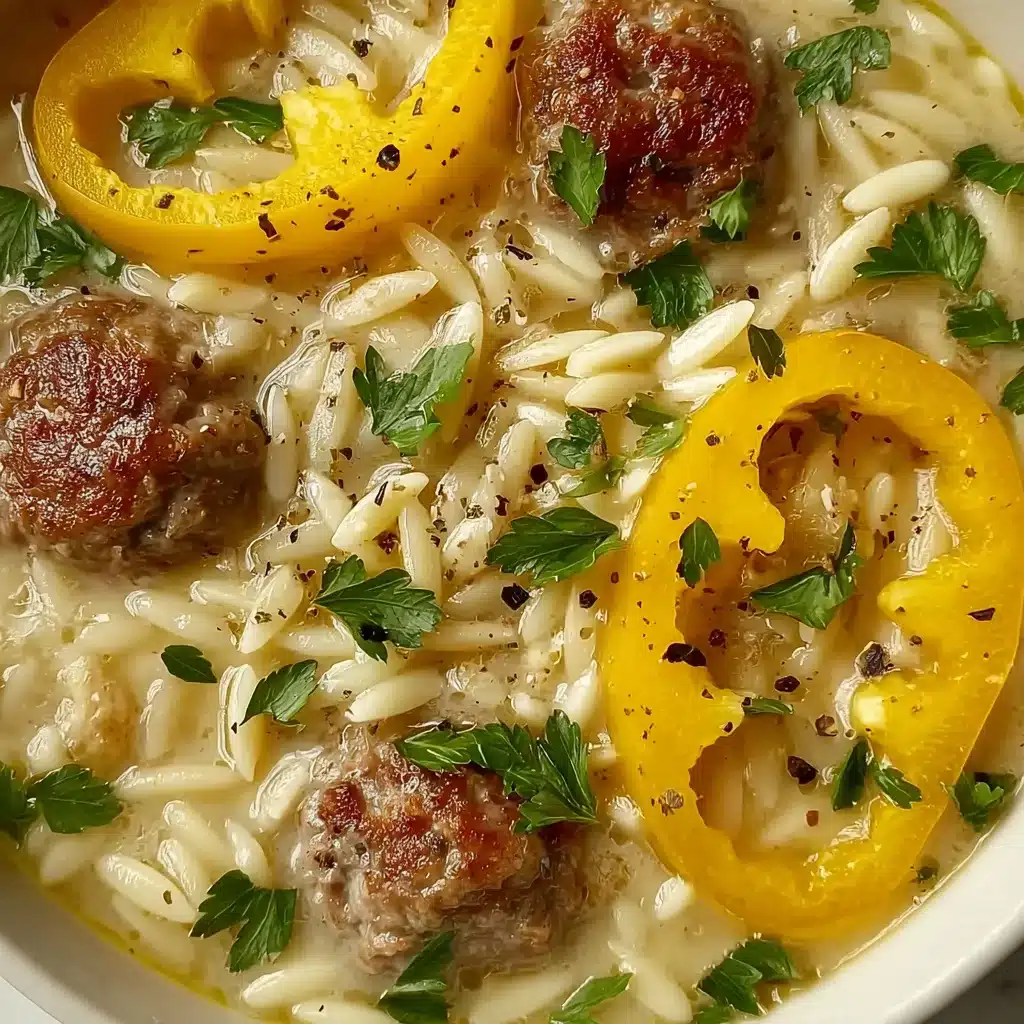 This Savory Orzo Stuffed Banana Peppers Soup is a rich, creamy, and flavorful dish featuring a blend of sautéed banana and green peppers, Italian sausage, orzo pasta, and a luscious mix of cheeses simmered in a herbed chicken broth. Perfect for a comforting and hearty meal, it combines the tangy heat of banana peppers with the smoothness of cream and Parmesan cheese.