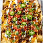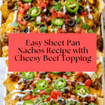 Keywords: sheet pan nachos, easy nachos recipe, baked nachos, ground beef nachos, snack recipe, party food
