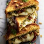 This Sourdough Pesto Grilled Cheese recipe combines the tangy and crusty sourdough bread with rich, gooey fresh mozzarella, flavorful sun-dried tomatoes, savory bacon, and vibrant pesto for a deliciously satisfying sandwich that’s perfect for any meal. Crisply buttered and pan-fried to golden perfection, these grilled cheese sandwiches deliver layers of melty cheese and savory fillings with a fresh herbaceous kick from the pesto.