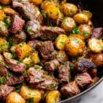 - Combine and Serve: Return the cooked potatoes to the skillet with the steak bites. Stir gently to combine and heat through. Taste and adjust seasoning with additional salt and pepper as desired. Remove from heat and garnish with freshly chopped parsley if using. Serve immediately and enjoy!