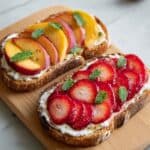 Two slices of toasted bread on a white plate, each topped with a creamy spread as the first layer. On the left slice, thin, soft peach slices are neatly arranged on top of the spread, with small green mint leaves adding color. On the right slice, bright red strawberry slices cover the spread, also decorated with small green mint leaves. Both toasts sit on a wooden board against a white marbled background. photo taken with an iphone --ar 4:5 --v 7