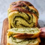 - Shape the bread: Roll the dough tightly into a log starting from the long side. Using a sharp knife, carefully slice the log lengthwise, leaving one end slightly intact. Twist the two halves over each other to expose the swirled herb layers. Coil the twisted dough into an “S” shape and place it onto a parchment-lined baking sheet.