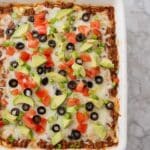 - Add Fresh Toppings: After baking, garnish the dip with diced tomato, olives, avocados, and any other desired toppings such as guacamole, lettuce, green onions, or cilantro before serving.