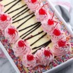 Keywords: banana split sheet cake, banana cake recipe, banana buttercream, strawberry buttercream, chocolate ganache, rainbow sprinkles, maraschino cherries, sheet cake, dessert