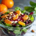 Keywords: winter salad, citrus salad, spring greens, pomegranate, feta cheese, candied pecans, honey Dijon dressing, healthy salad